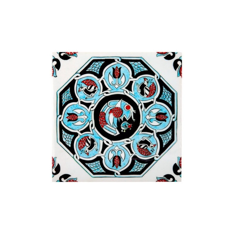 Ce carreau en faïence est décoré d'oiseaux dans un ensemble merveilleux fait de contrastes entre le bleu turquoise et le noir. Des touches de rouge vif viennent souligner le plumage des oiseaux.