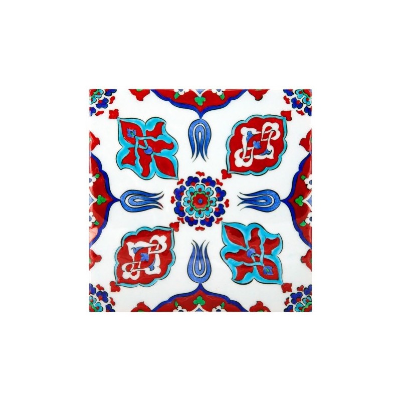 Ce magnifique carreau de faïence est décoré de motifs géométriques et floraux à dominante rouge. Il s'inspire de la tradition des carreaux ottomans qui décorent les monuments d'Istanbul.