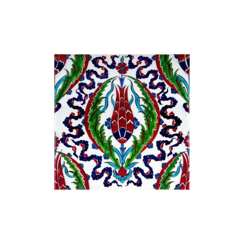 Ce magnifique carreau arbore une tulipe comme motif principal. Elle est entourée de feuilles saz typiques du style ottoman Iznik.